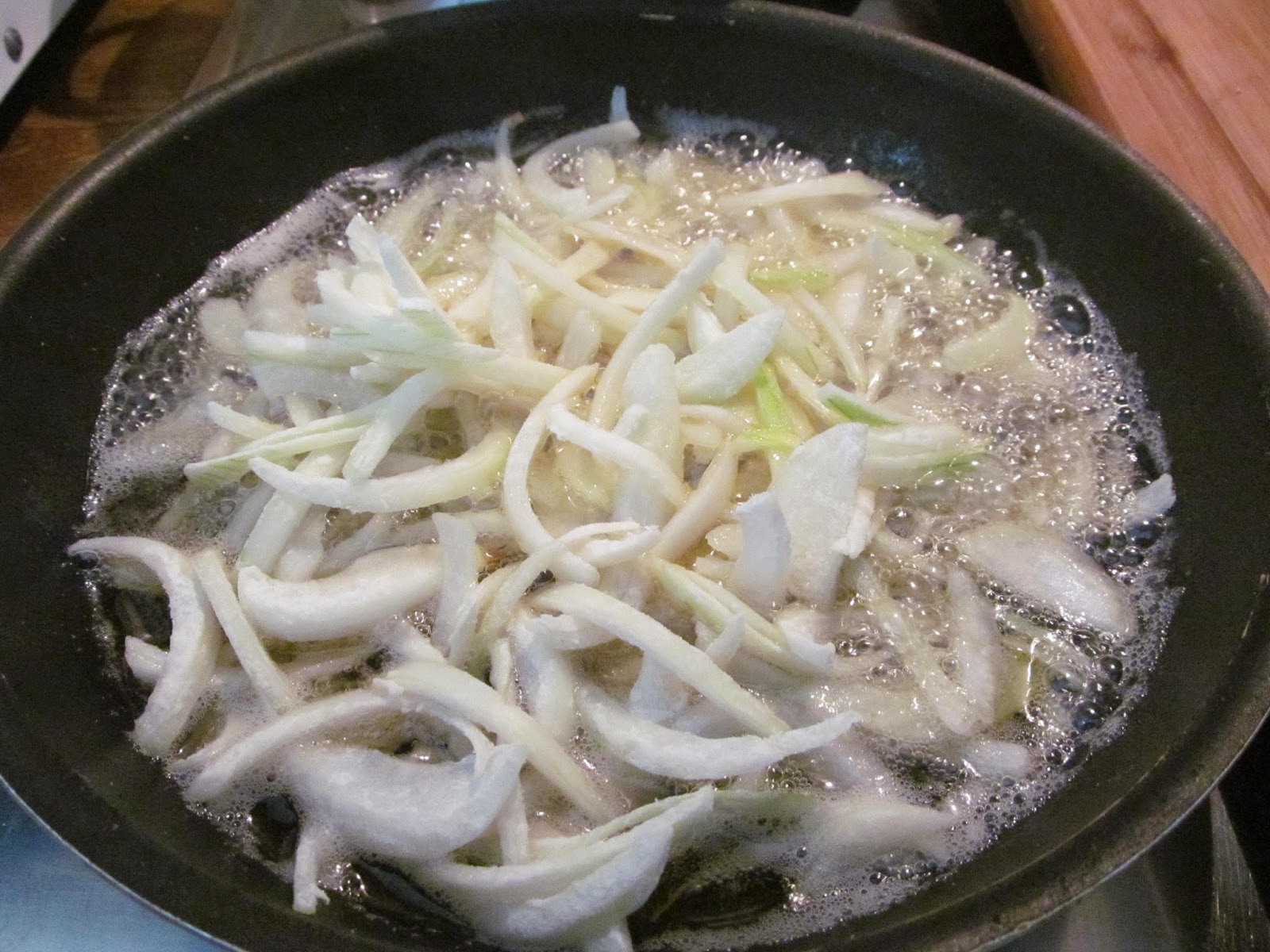 • В подходящ тиган, загрявам олиото и пускам лучените лентички да се изпържат. По подробно описание за приготвянето им ще прочетете тук.