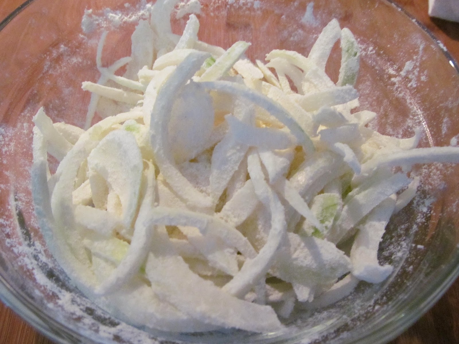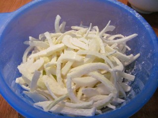 • Пресявам брашнените лучени лентички в сито, за да се отдели излишното брашно.