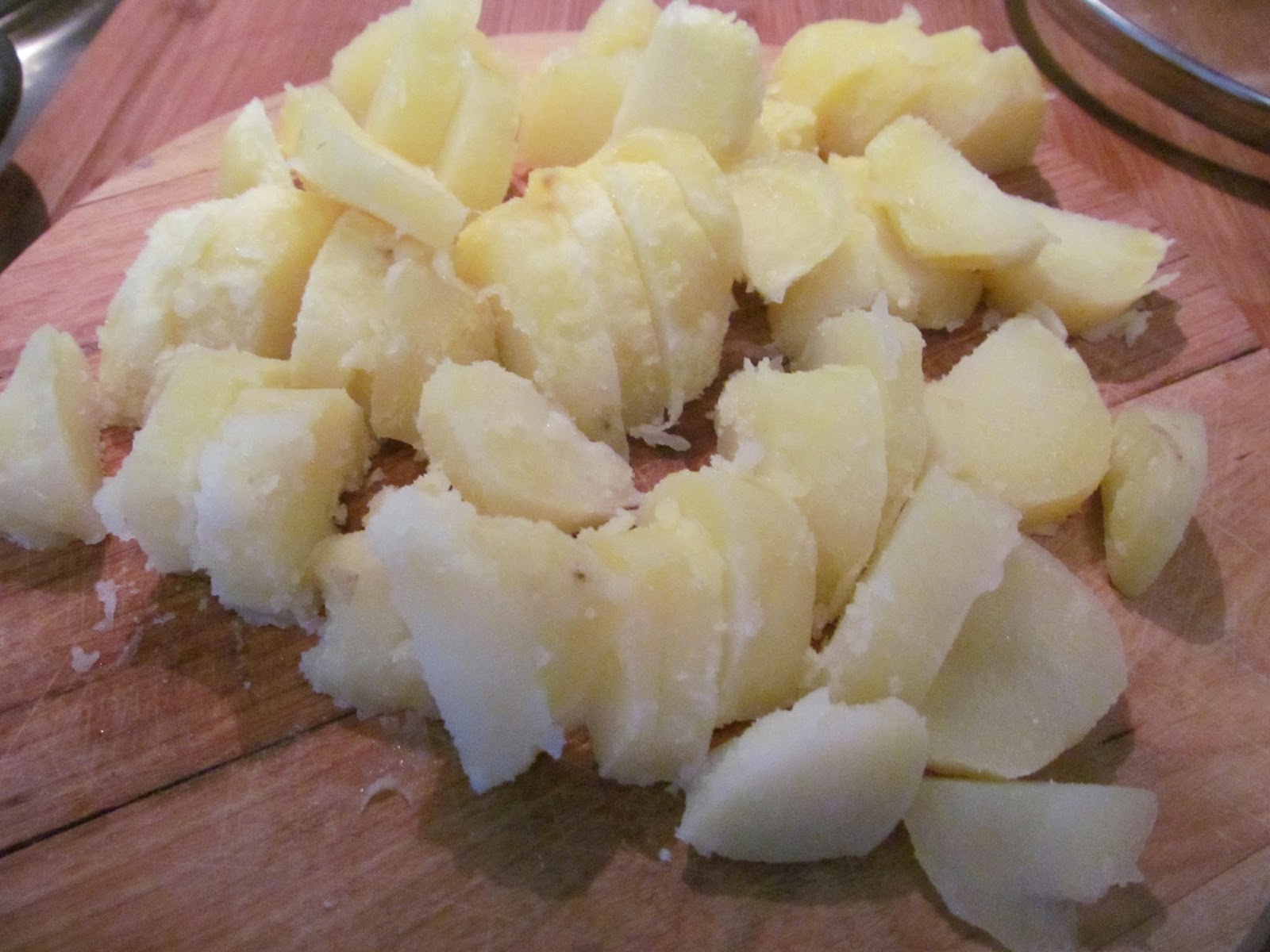 • Обелвам сварените картофи и нарязвам на средно дебели филийки, а ако са много големи на размер – първо разполовявам и после, всяка половинка нарязвам на филийки. Горе – долу с размер 5 см. и дебелина 0,5 см.
