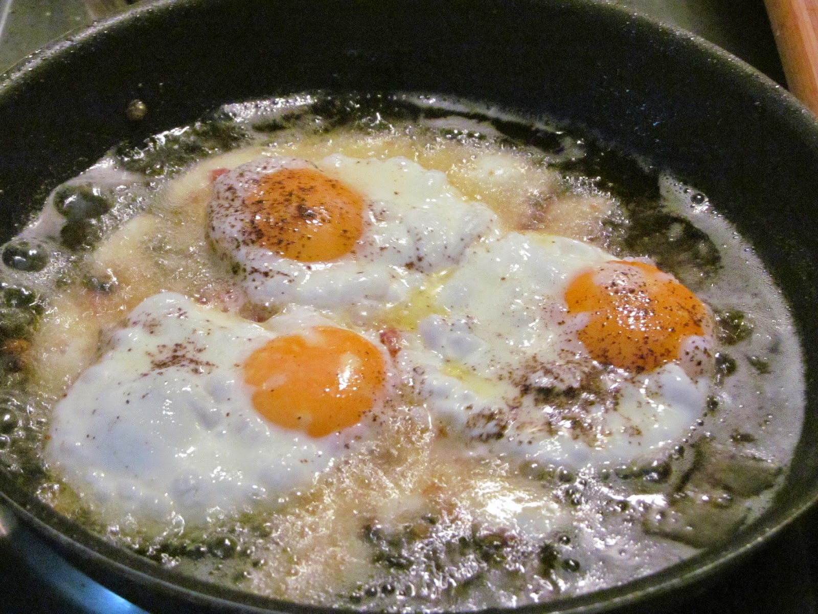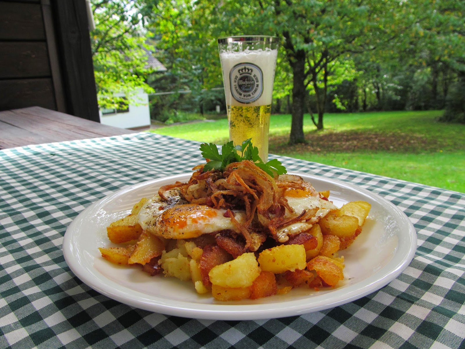 Това ястие е комбинация от други две, които вече съм публикувала, но като гарнитури към основни ястия. Немските пържени картофи или Bratkartoffeln в комбинация с хрупкав пържен лук и като за финал яйца на очи е едно много обичано от немците ястие. Много от Вас ще си кажат – изключително вредно. Да, ама не! Традиция  и много уважавана в немската кухня е пържената храна. Като започнем от известните шницели, преминем през всичките видове стекове и завършим с немските пържени картофи, но всичко изпържено във висококачествени и здравословни мазнини. Тук нито един лекар няма да Ви забрани пържената храна. Според тях не е въобще вредна за организма.