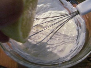 - В подходяща по размер купа, разбивам сметаната и сока на лимона. Добавям захрта и сол, и черен пипер на вкус.