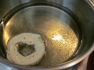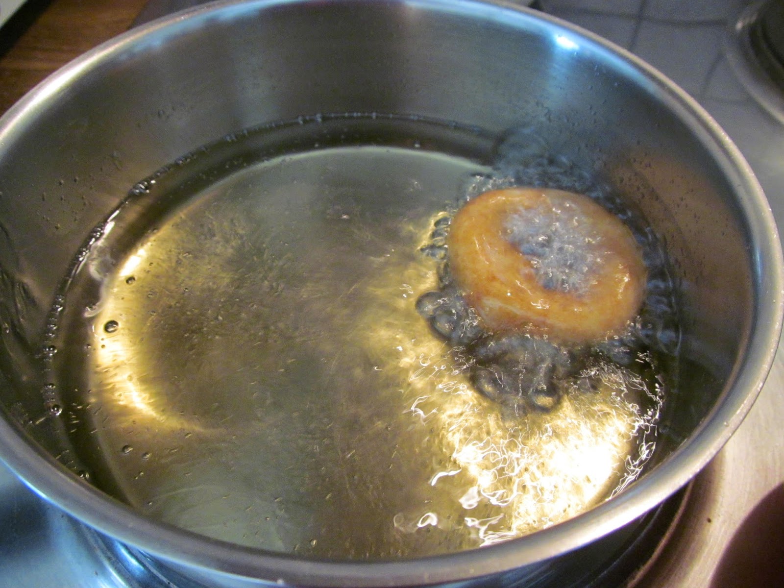 - Пускам лучените кръгчета в предварително загрята мазнина – на максимална степен на котлона. Винаги използвам малка по размер тенджерка, за да не се налага да употребявам голямо количество олио. Количеството олио – определяте Вие сами. Важно е лучените кръгчета да плуват в олиото и да се получи ефекта на фритирането. Не препоръчвам да се използва фритюрник при този вид панировка!