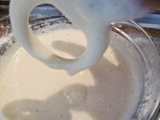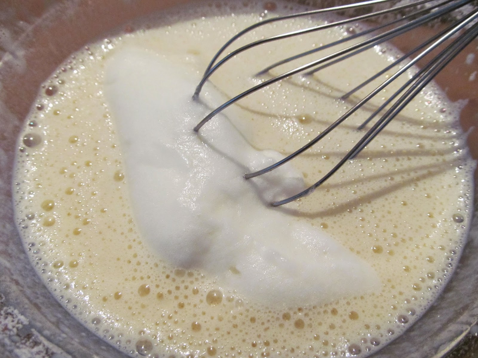 - На два пъти добавям разбития на сняг белтък, към жълтъка и разбърквам с тел за разбиване. Разбъркването е много бавно. Миксер не се използва тук, защото така ще спадне белтъкът и ще се загуби точно тази пухкавост и въздушност, която той дава на панировката.