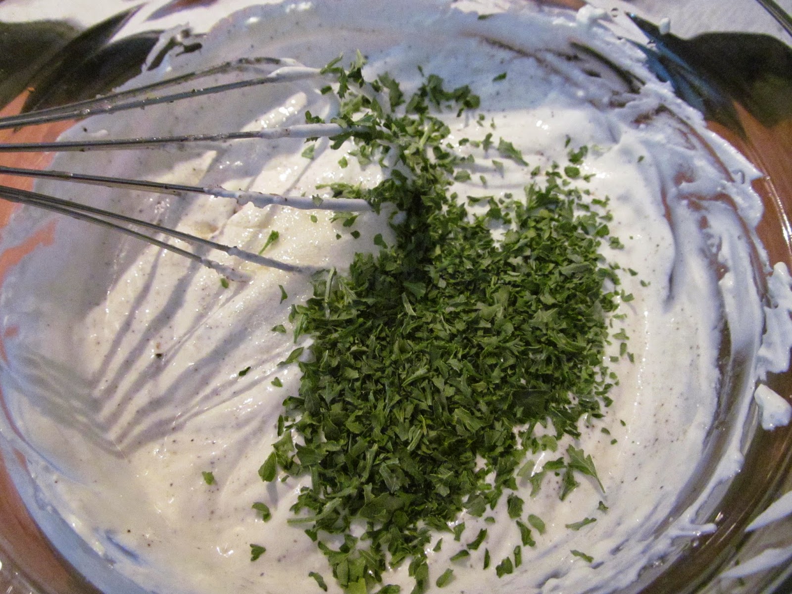 - Магданозът нарязвам на ситно и добавям към сметановия крем. Разбърквам.