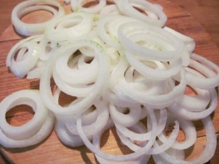 - Обелвам лука и го нарязвам на тънки кръгчета.