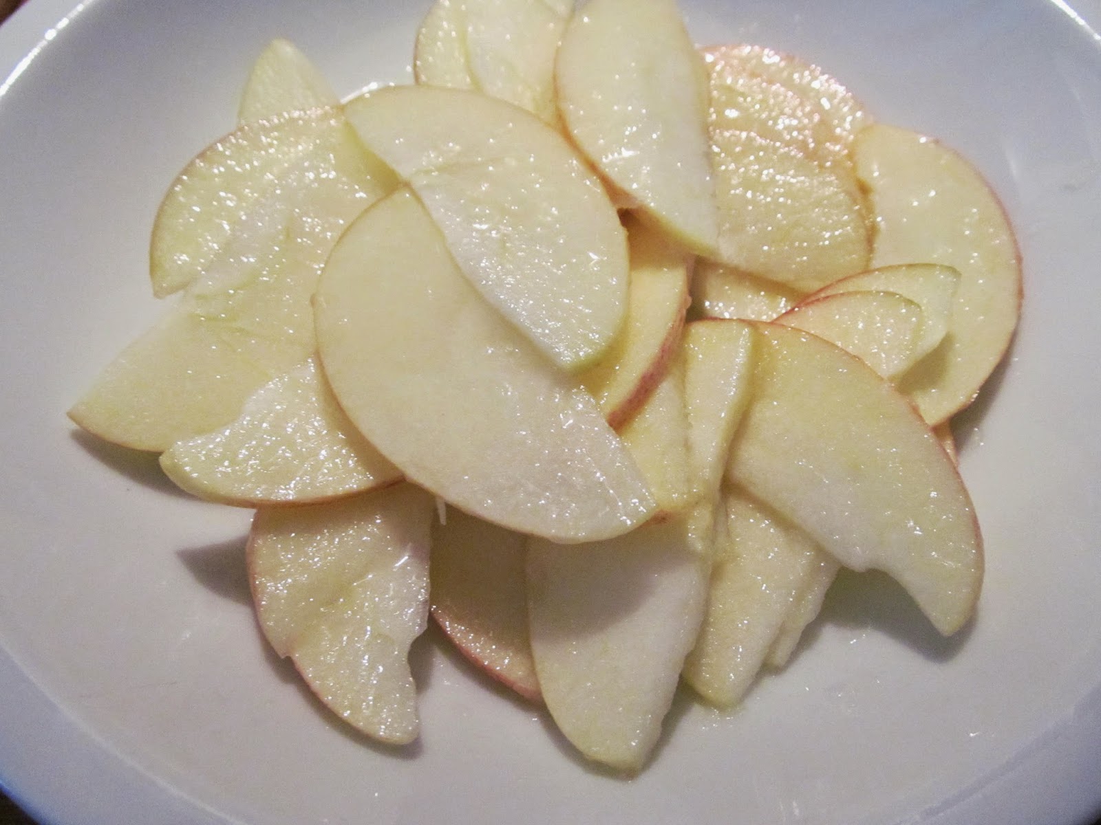 - Отделената ябълка измивам, отрязвам на половина, почиствам от семките и нарязвам на много тънки филийки, които поръсвам с останалия сок от лимона. Това е с цел – да не потъмняват ябълките.
