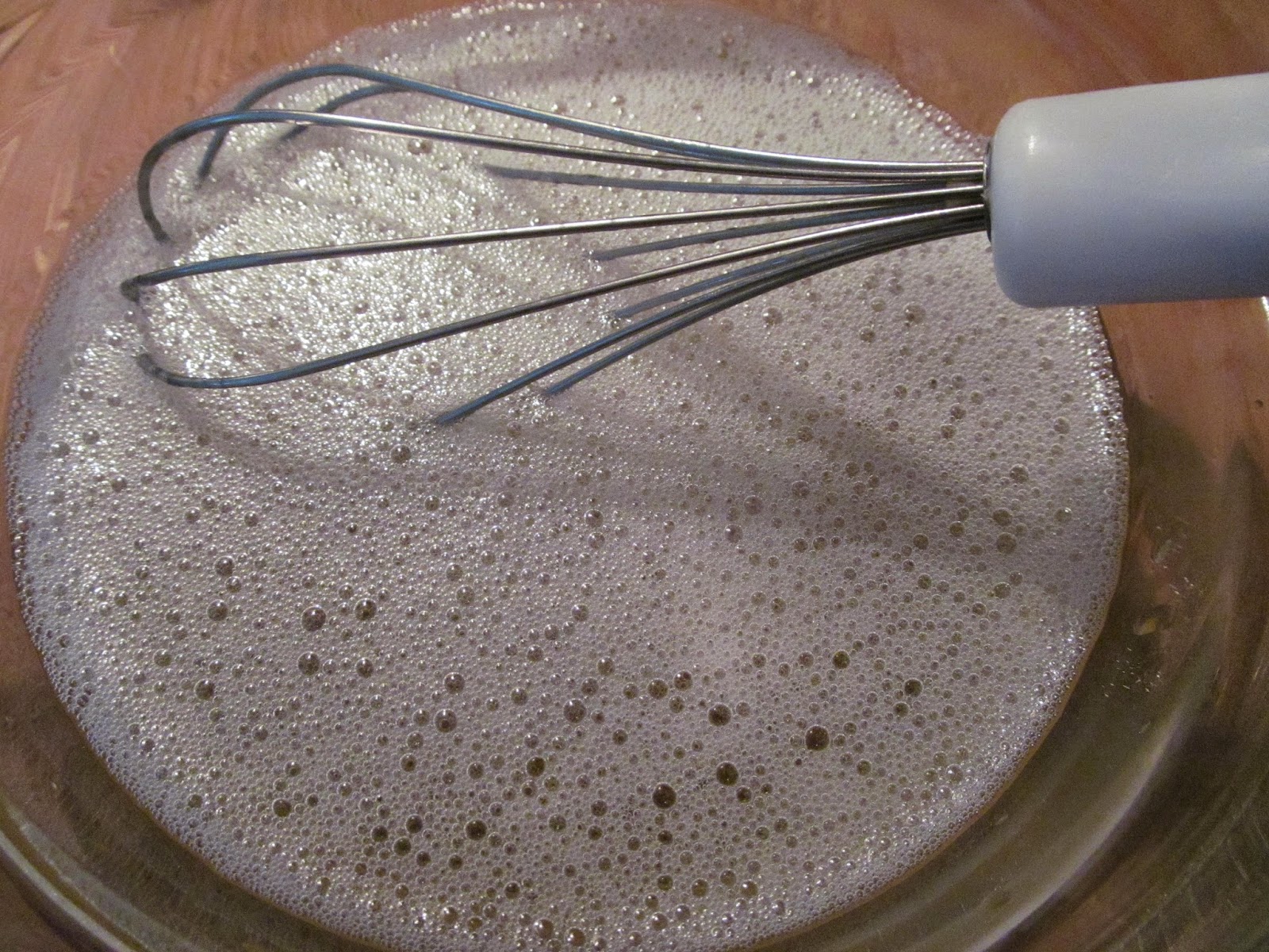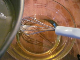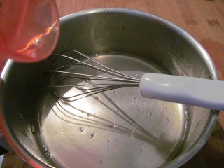 - Сега добавям желатина към останалия сироп от бъз, като отново разбърквам с тел за разбиване. Тази последователност трябва да се спази – топлия желатин се добавя към студения сироп от бъз.