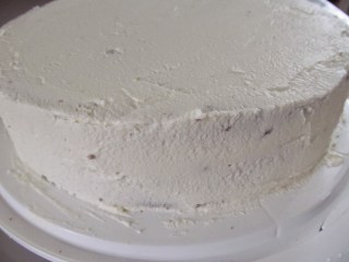 - Намазвам обилно тортата отгоре и отстрани, като си оставям малко количество за шприцоване на розички.