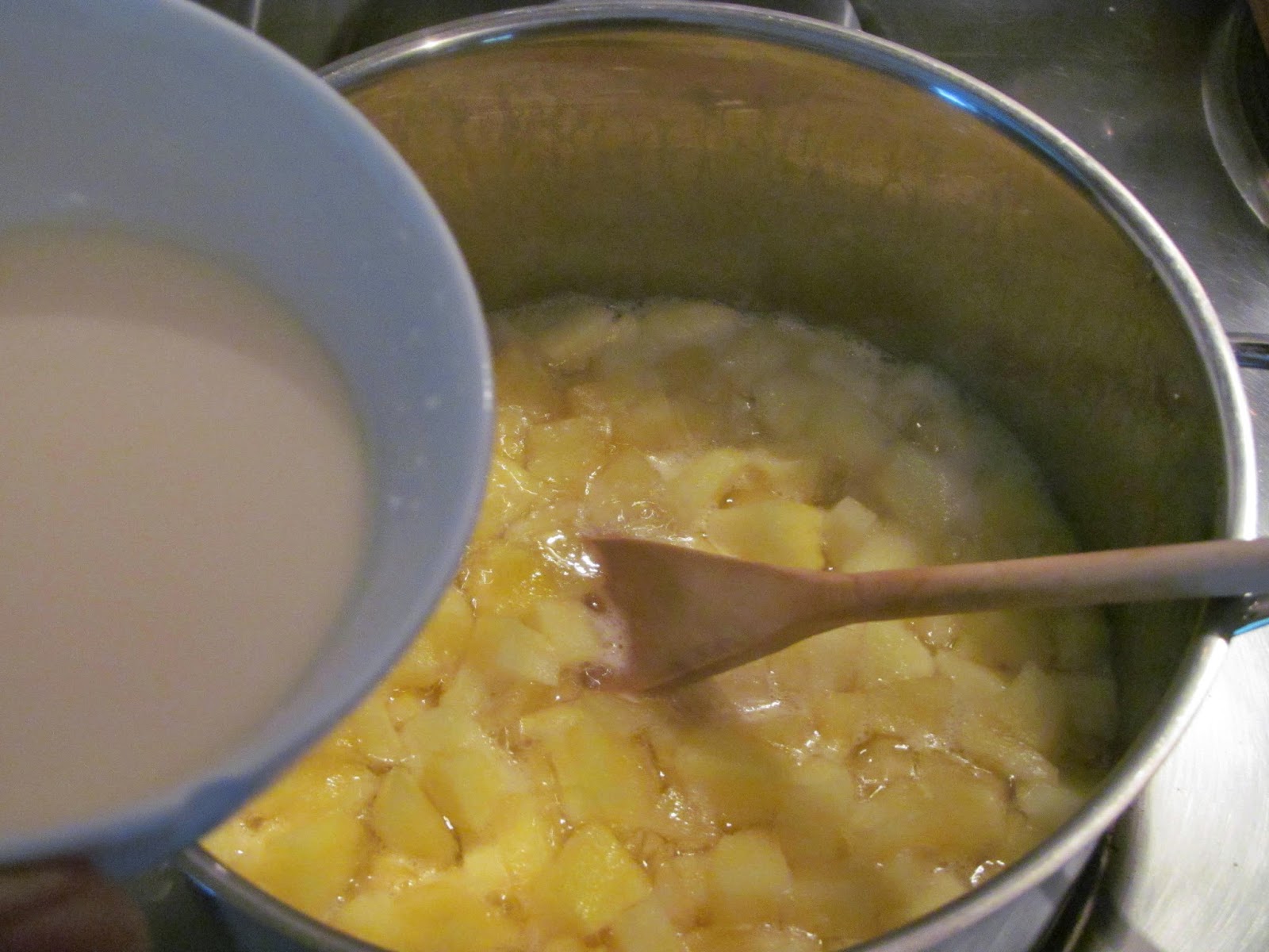 - Когато изминат 4-те минути на варене на ябълките, изключвам котлона и докато тенджерката е още на котлона – добавям към ябълките разтвореното нишесте, като постянно разбърквам ябълковата смес с дървена лъжица.
