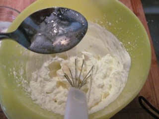 - Лъжица, след лъжица добавям от желатина към сметаната, като разбърквам леко сметаната.