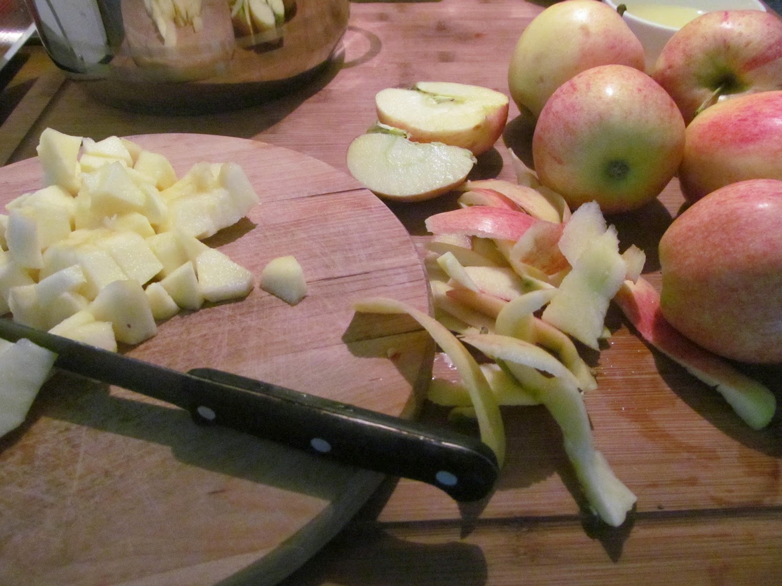 - Отделям една ябълка за декорация и останалите ги измивам, обелвам, изчиствам от семките и нарязвам на малки кубчета.