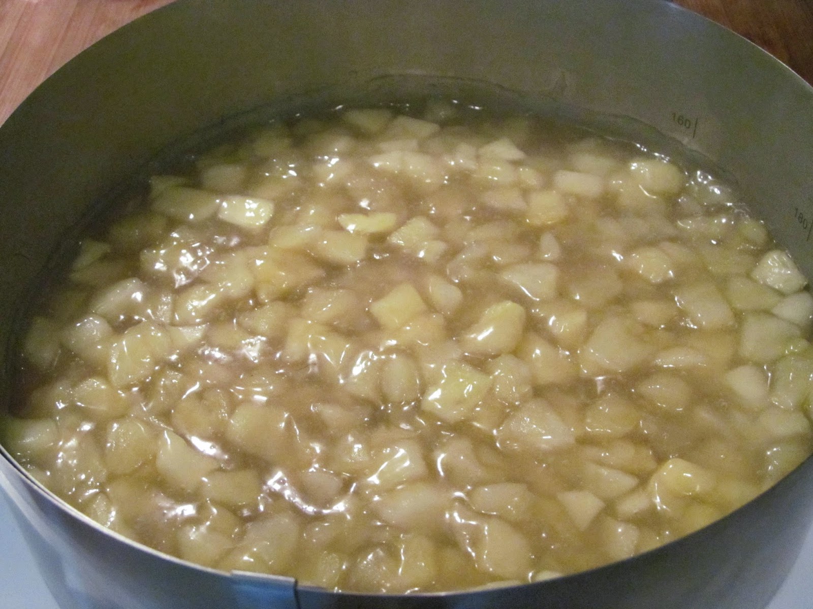 - Изсипвам ябълките върху подготвения първи блат за тортата. Подравнявам.