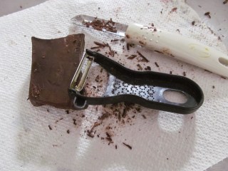 - С помощта на белачката за краставици или белачката за картофи, настъргвам от шоколада лентички.