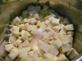 - Изсипвам ябълковите кубчета в подходяща по размер тенджерка, поливам с 3 с. л. от лимоновия сок, поръсвам със захарта и добавям 100 мл. от ябълковия сок.