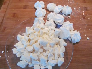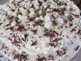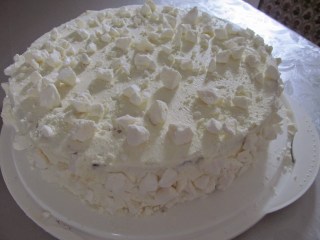 - Поръсвам отгоре и залепвам отстрани на тортата натрошените целувки.