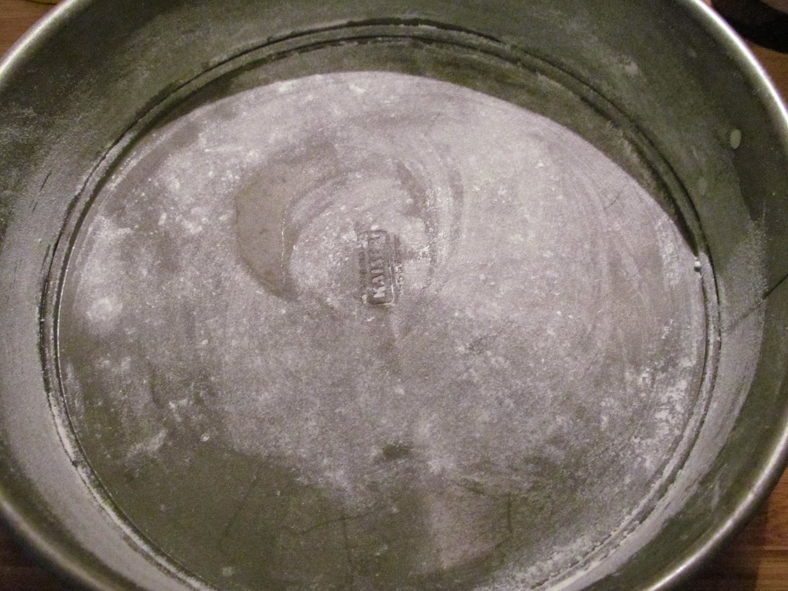 - Намазвам формата за торта с олио и поръсвам с брашно.