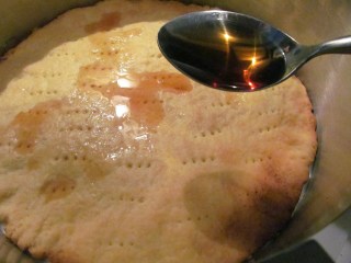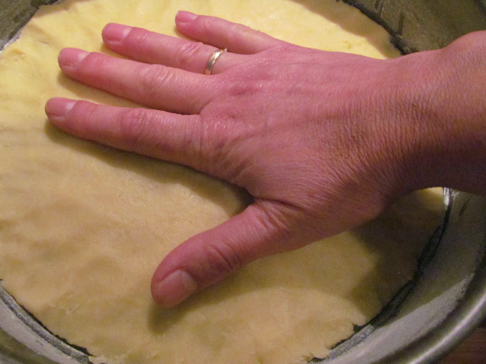 - Слагам топката тесто във формата и с ръка разстилам по дъното на формата, така че да го покрие равномерно.