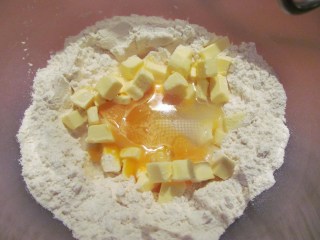 - Брашното изсипвам в купа и размесвам със солта. Правя кладанче в брашното и добавям студеното масло, но нарязано на малки кубчета, захарта,жълтъка и 3 с. л. студена вода.