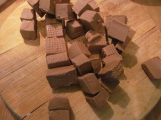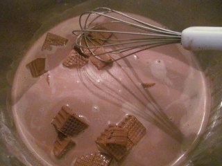 - Добавям кубчетата лешникова нуга към пудинговата смес и разбърквам, докато се разтопят.