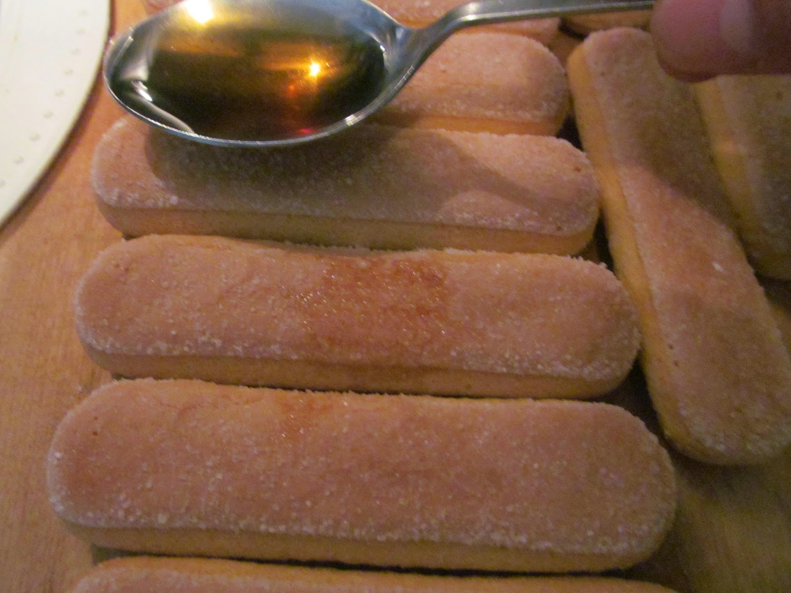 - Подреждам на равна повърхност бишкотите и ги заливам с 12 с. л. бадемов ликьор.