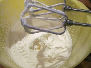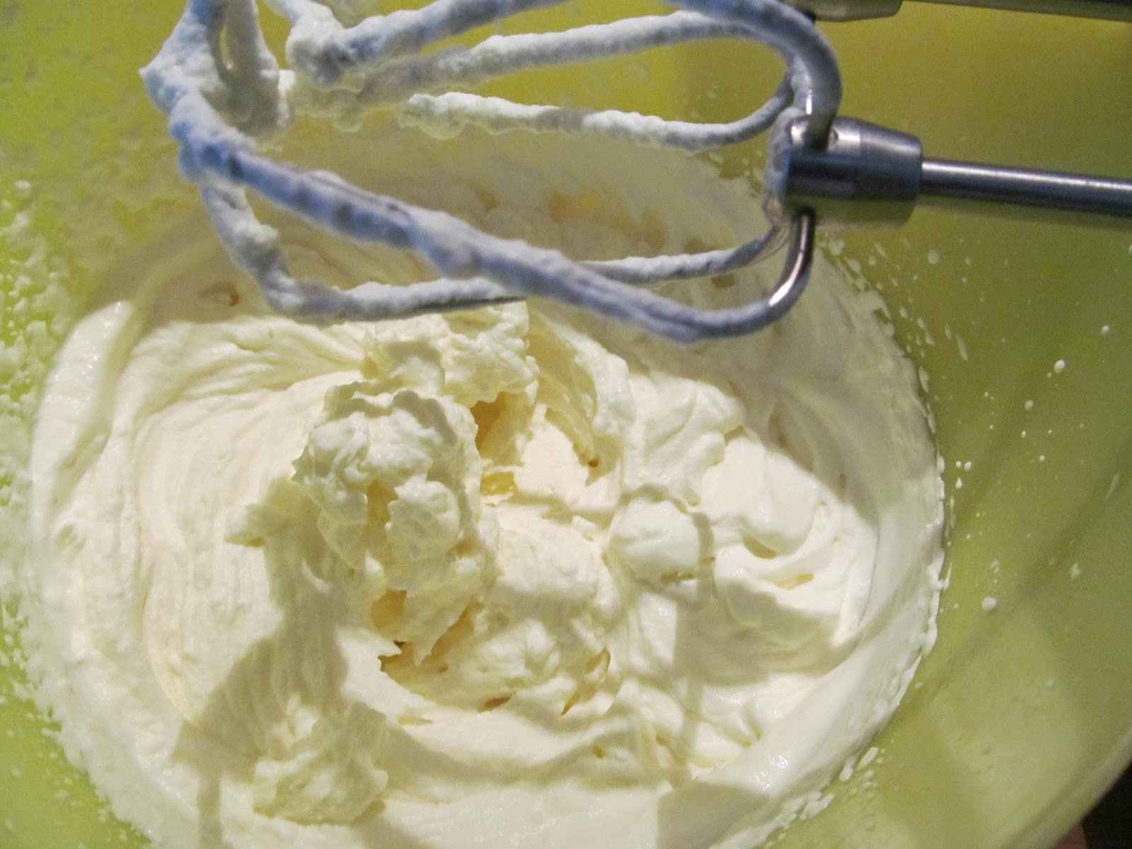- Разбивам 400 мл. студена сметана, за около 5 минути с миксера на максимална степен, или докато накрайниците на миксера започнат да правят черти.