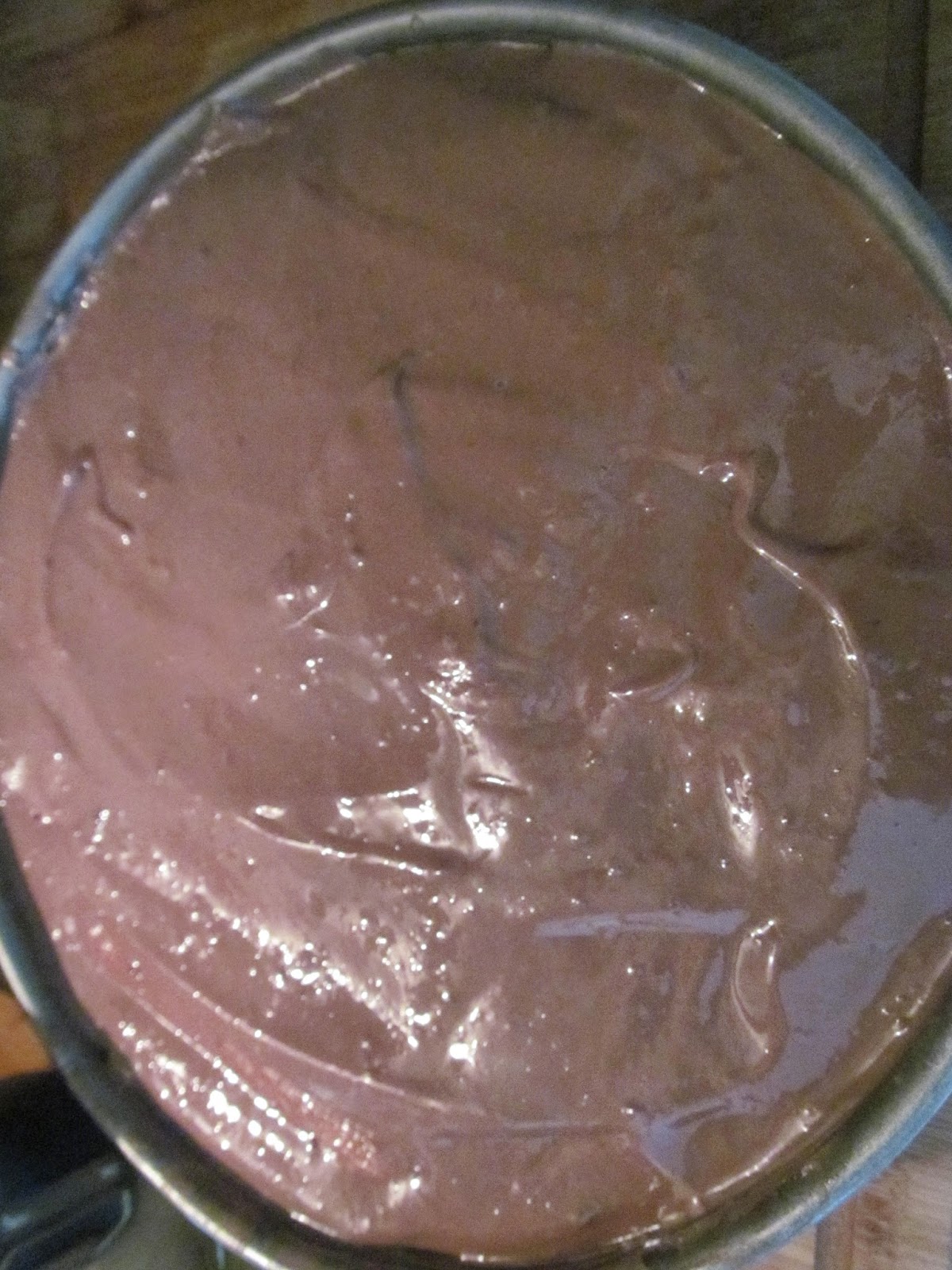 - Изсипвам 1/3 от нуга крема върху блата за торта и подравнявам.