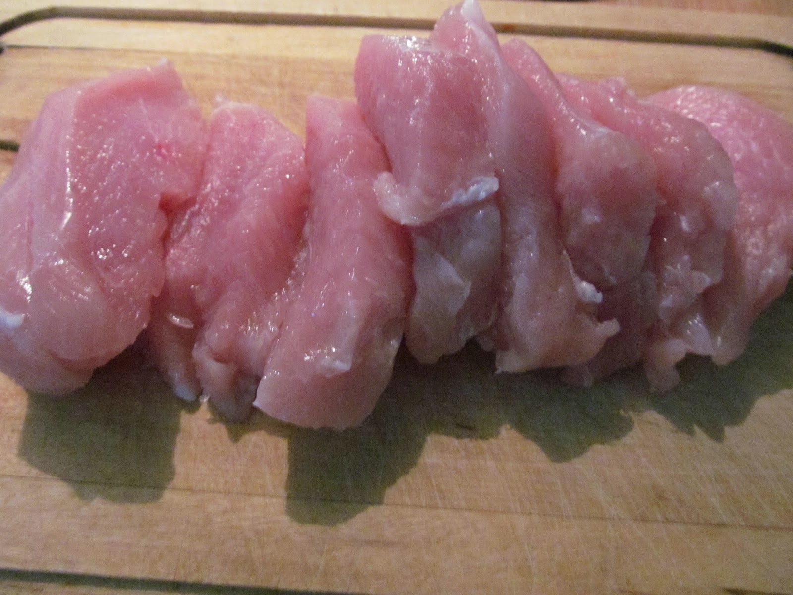 - Нарязвам пуешкото филе на стекчета /малки филийки с дебелина около 1,5 см/.