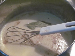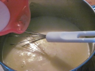 - Разреждам кашата със студеното прясно мляко. Бъркането продължава, а котлона е на ниска степен. Не бива кашата да бълбука силно. Само леко да къкри. Не забравяйте, че фрикасето залепва много бързо и лесно за дъното на тенджерата, а това може да промени вкуса и на ястието.