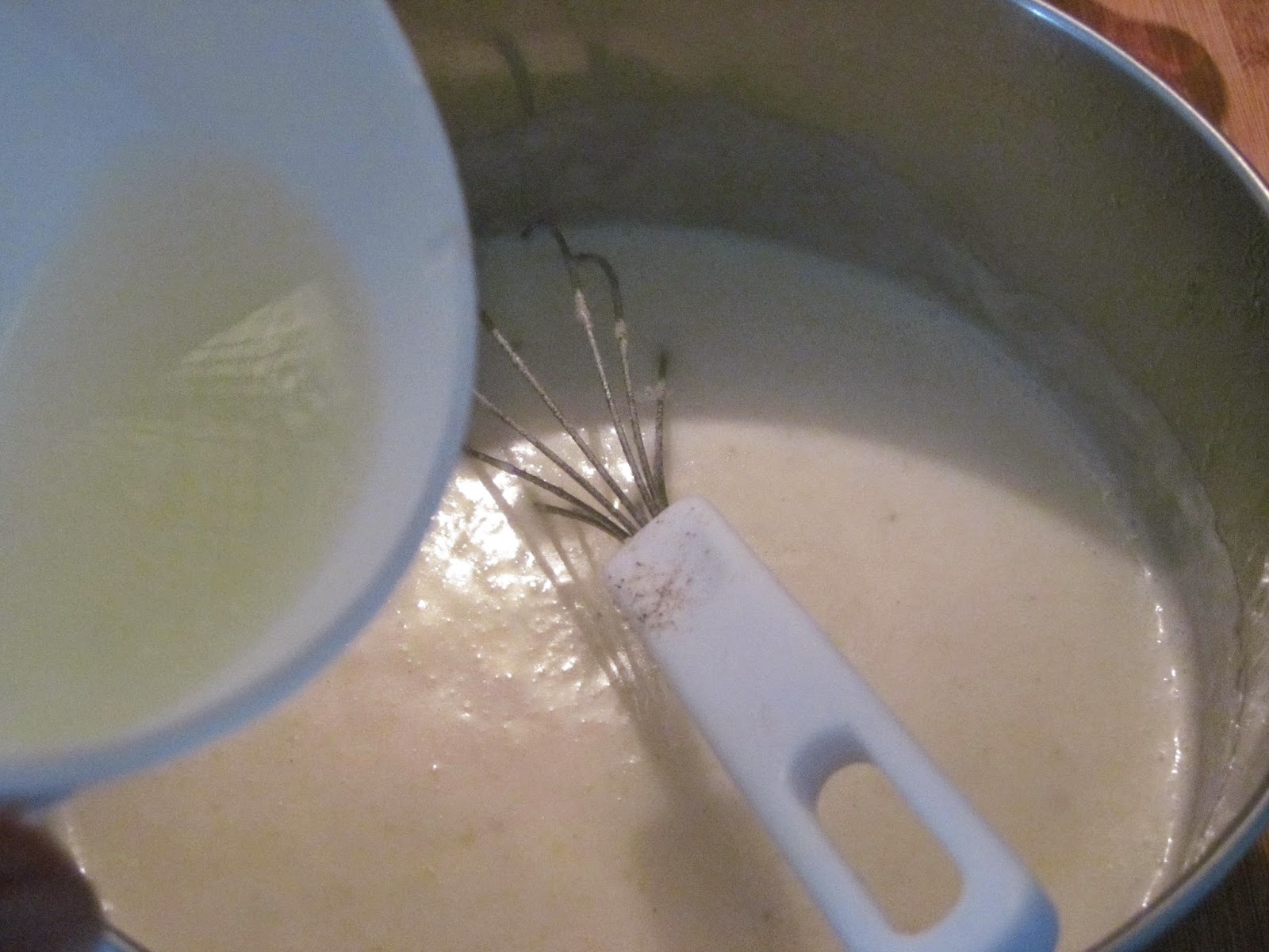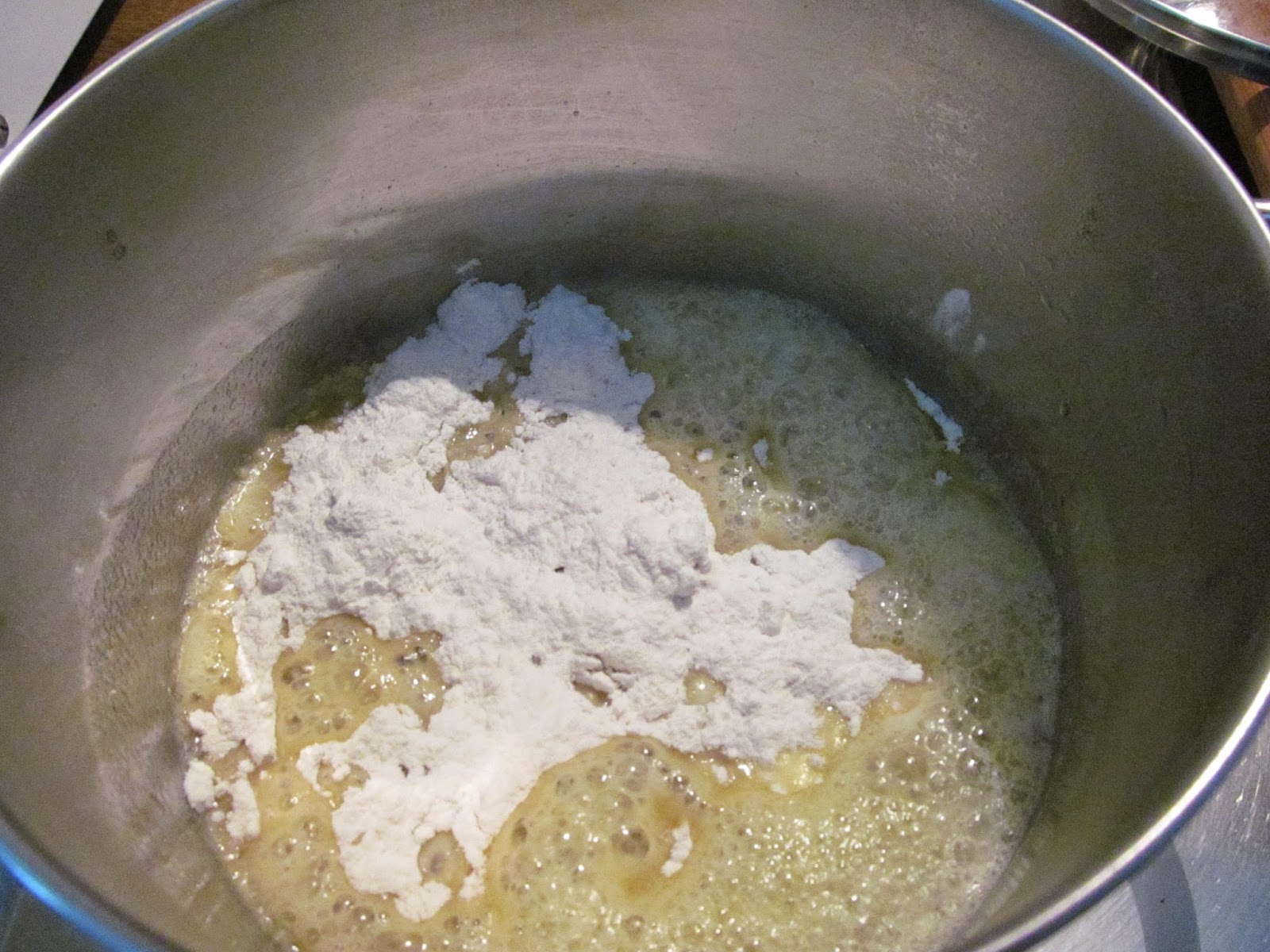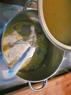 - Добавям горещия бульон към брашното и разбърквам, за да се получи гладка каша.