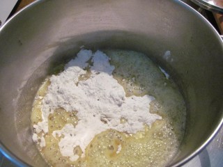 - Добавям брашното и разбърквам, за да не залепва по дъното на тенджерката. Пържа брашното само около минута или да получи златист цвят.