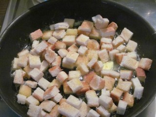 • Изпържвам хлебните кубчета на максимална степен на котлона, като ги разбърквам непрекъснато, за да получат тъмен златист цвят от всички страни.