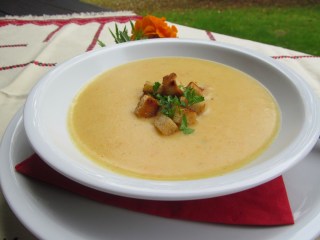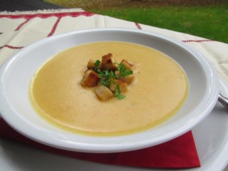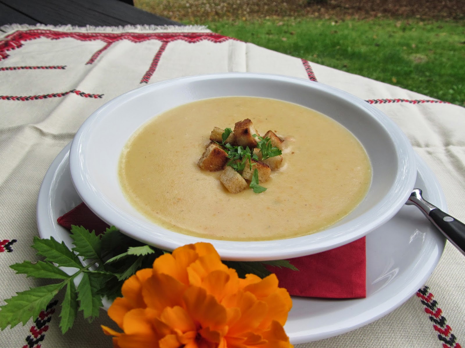 Сервирам супата гореща, декорирана с няколко крутончета и ситно нарязан магданоз.