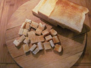 • Изпичам филийките хляб на тостера и нарязвам на малки кубчета.