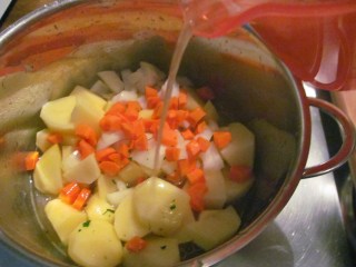 • Сипвам всички зеленчуци в подходяща по размер тенджера и заливам с бульона.