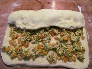 - Върху разстланото тесто, разпределям равномерно плънката.
