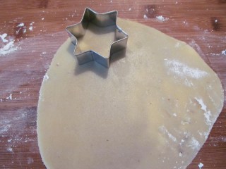 - От останалите 50 гр. марципанено тесто, върху наръсена с пудра захар плоскост, разточвам малка и тънка кора. Изрязвам с помощта на формичка звездички.