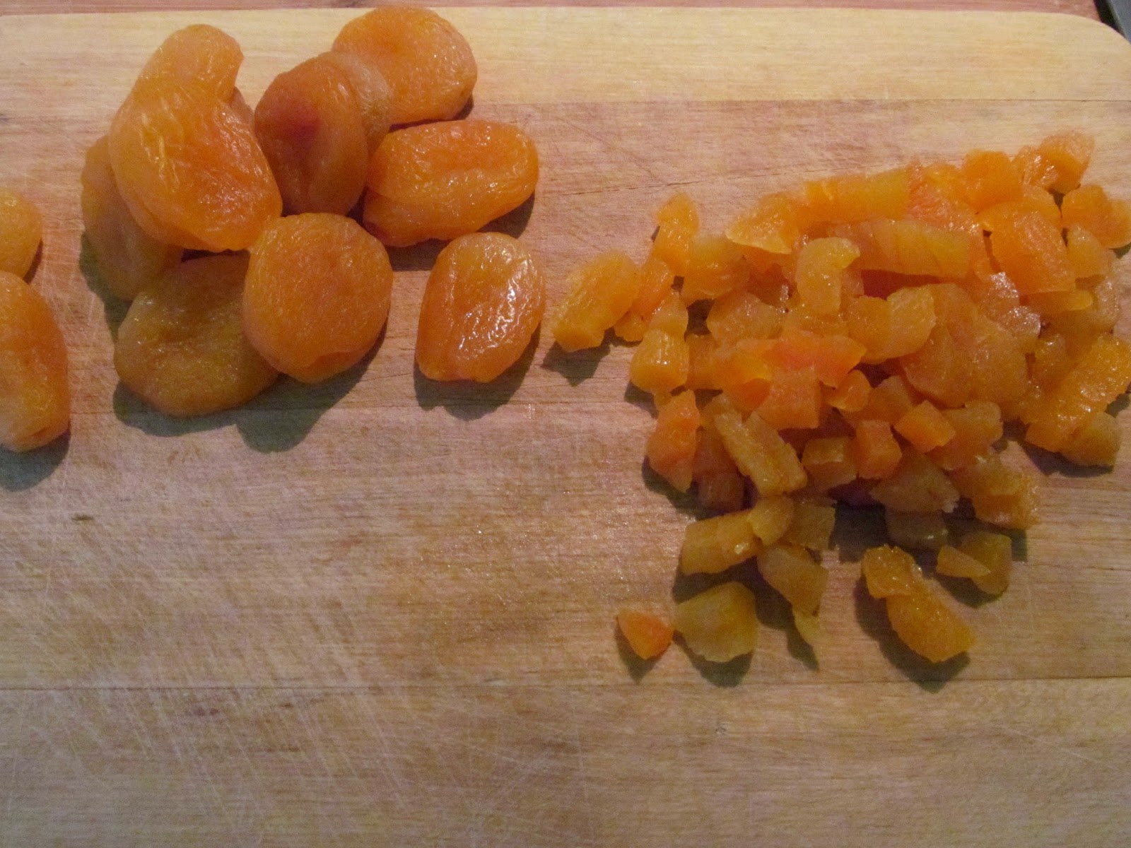 - През това време си приготвям плънката. Нарязвам всичките сушени кайсии на ситно.