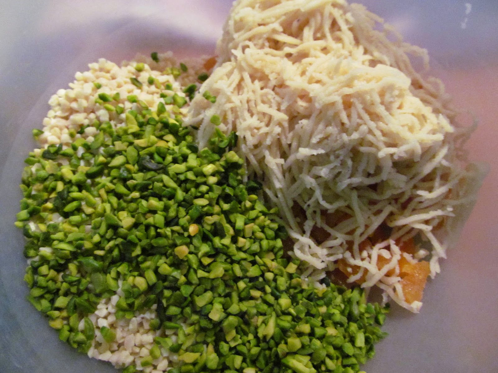 - Изсипвам в купа кайсиите, настъргвам 150 гр. от марципана върху тях, добавям счуканите на ситно шам фъстък и бадеми. Разбърквам или омесвам на ръка, защото марципана е също като тесто и за да се разпредели равномерно, беше нужно да омеся всичко на ръка.
