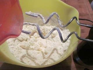 - Започвам да разбивам с миксера, с накрайниците за тесто като добавям на тънка струйка от разтворената в млякото мая.