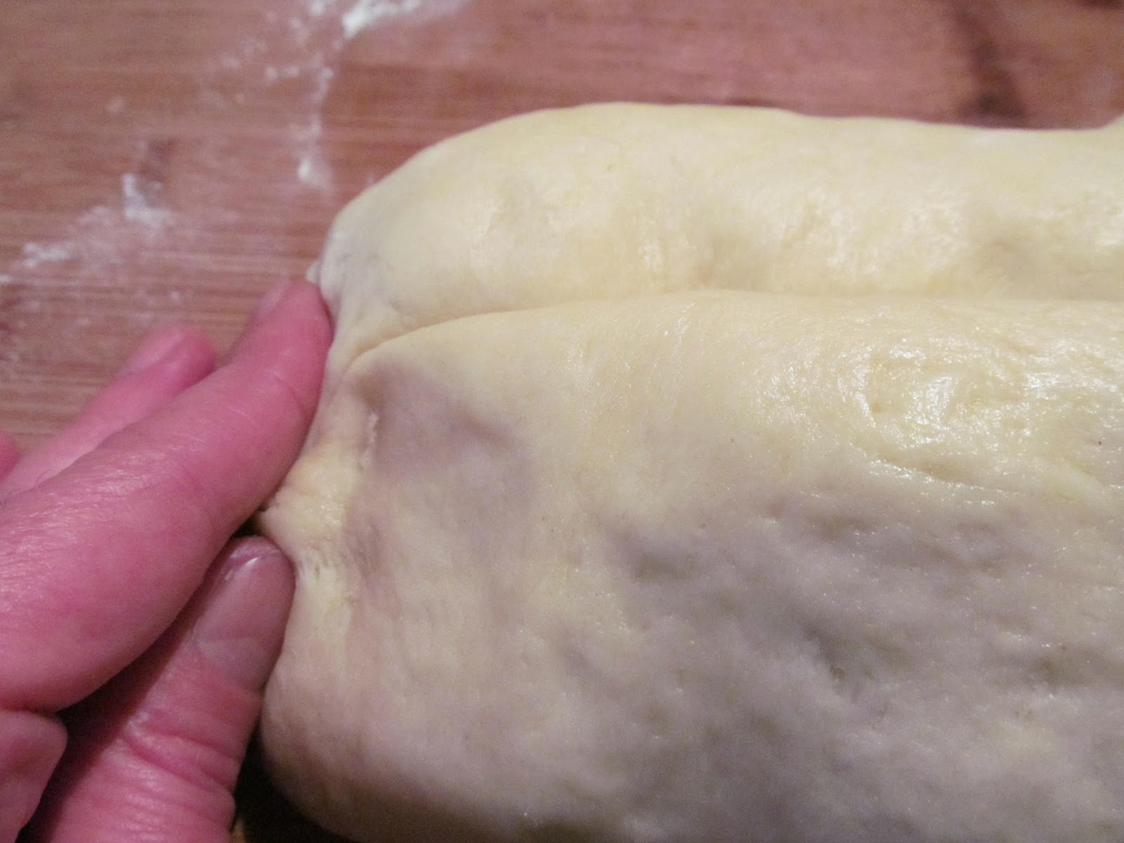 - Втасалото вече тесто, разстилам върху набрашнена плоскост до квадрат с размер 30х30 см. Избягвайте да обработвате втасалото тесто с мая, върху мраморни или метални плоскости, защото този вид плоскости са винаги студени и това се отразява на тестото с мая.