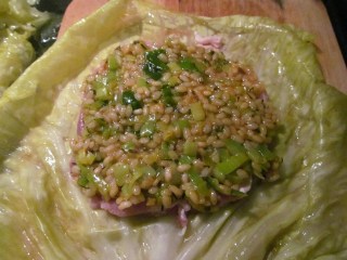 - Прегъвам зелевото листо от долната и горната си част, върху стека.