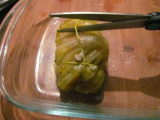- Изваждам внимателно сармите във подходяща тавичка и с помощта на ножица отделям конците.