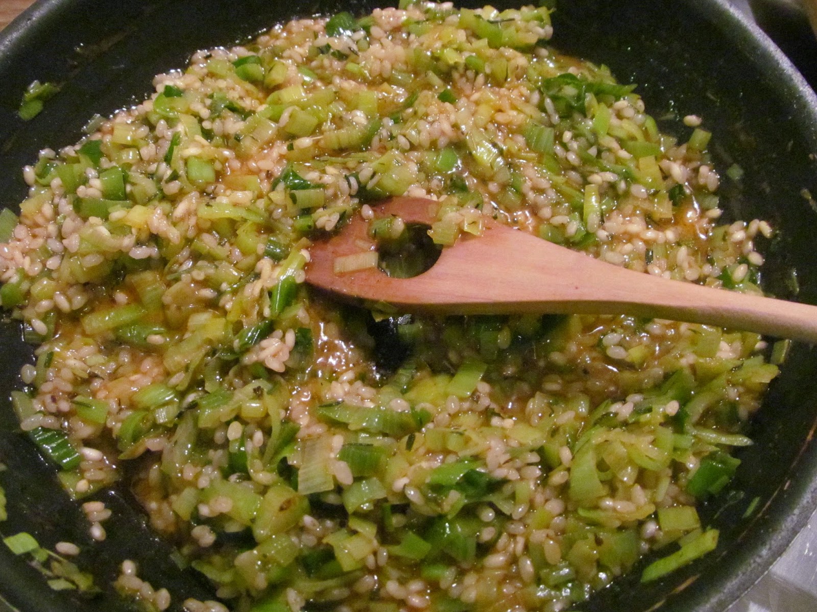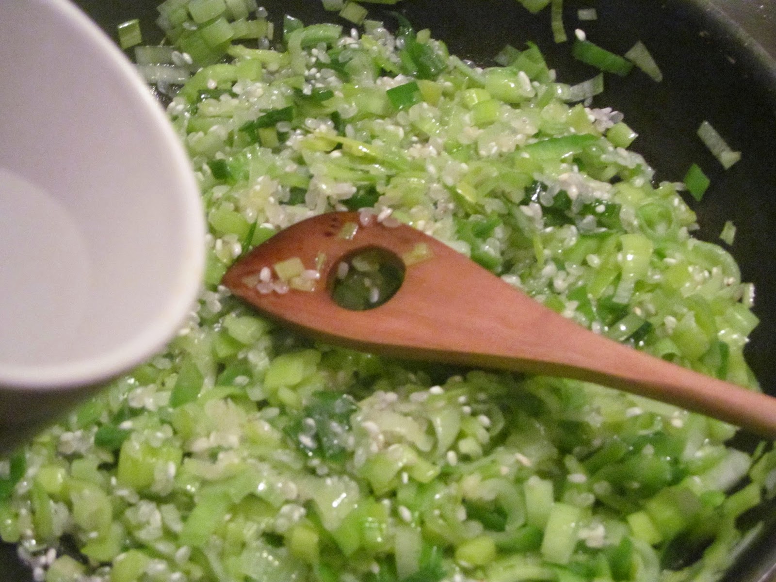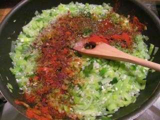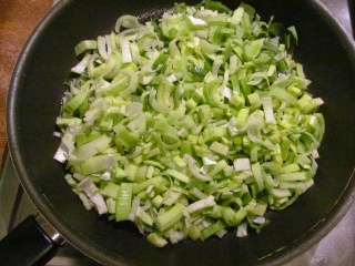 - Загрявам олиото в тефлонов тиган и запържвам в него празия лук до омекване.