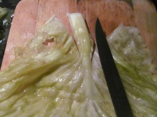 - С помощта на остър нож, отделям твърдата част от зелевите листа.