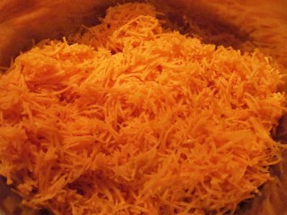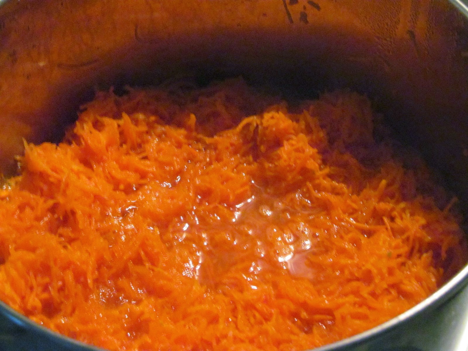- Настъргвам морковите на ситно в подходяща по размер тенджерка.