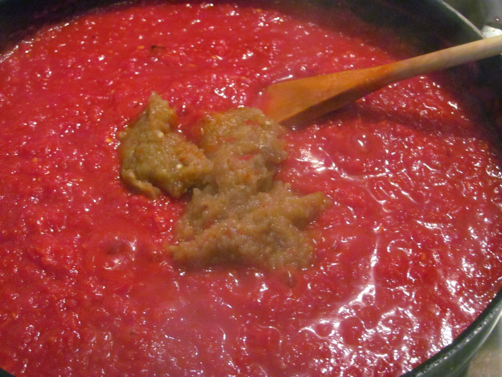 • След около час, течността от доматите и чушките беше извряла и при бъркане, лъжицата започна да остава черти в пюрето. Това означава, че лютеницата е достатъчно гъста.