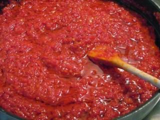 • Изсипах пюретата от домати и чушки в най-големия си тефлонов тиган, който е и малко по-дълбок. Включих котлона на средна мощност.