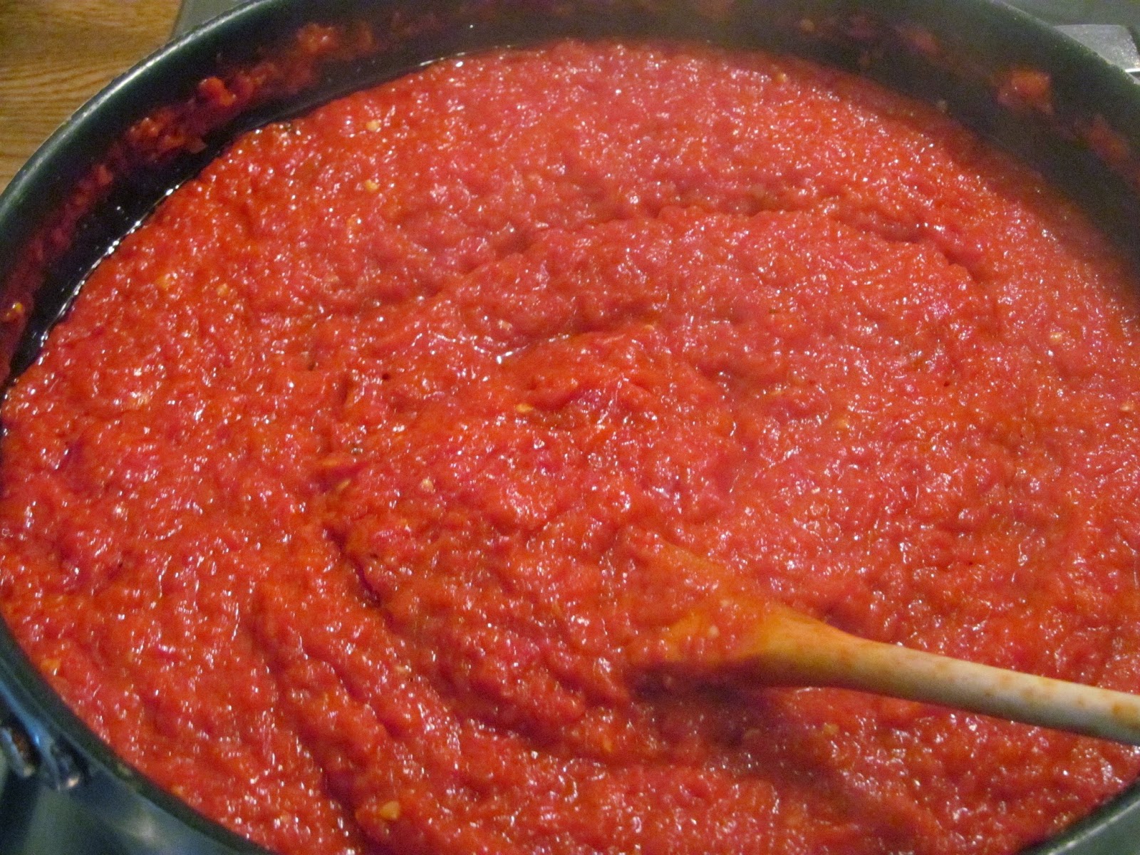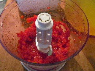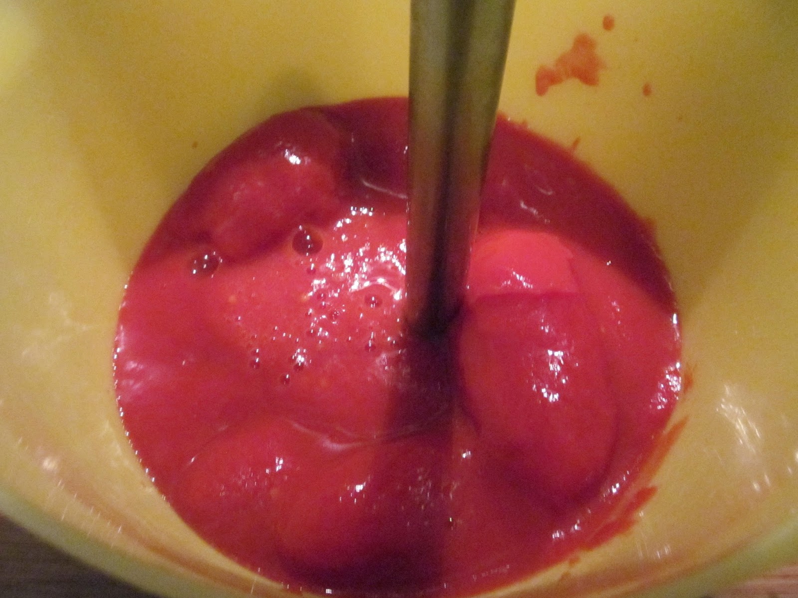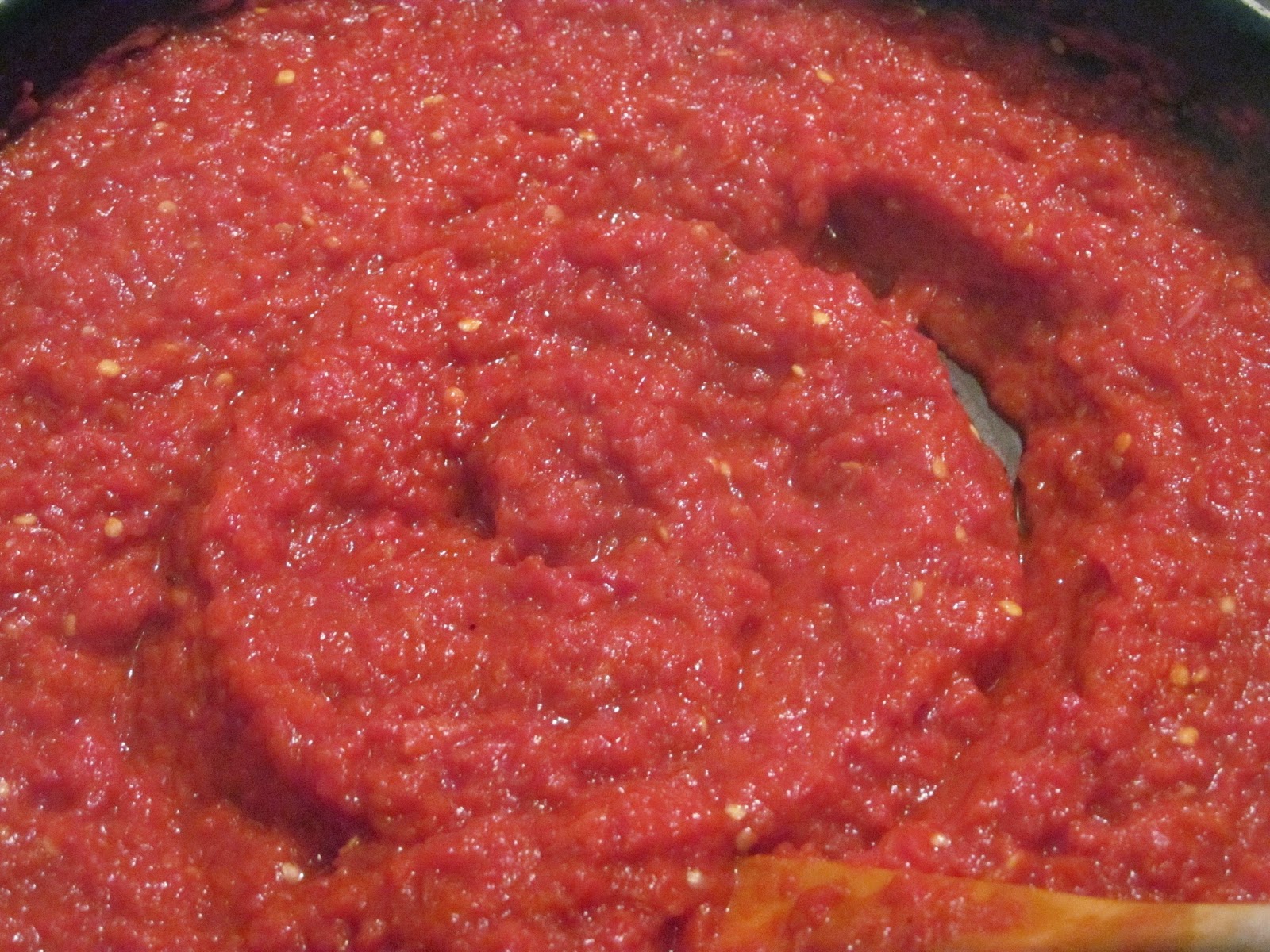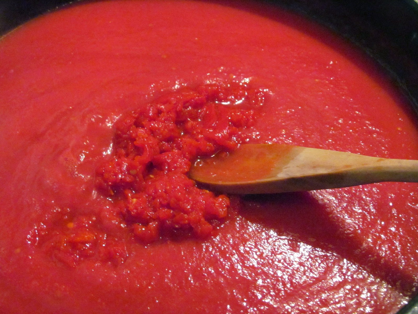 • Изсипах двете консерви домати в подходящ съд и с помщта на пасатора ги пасирах. Ако нямате пасатор – използвайте блендер или машинка за мелене на месо. А пък става и само да се минат през цедка, но е доста трудоемко.