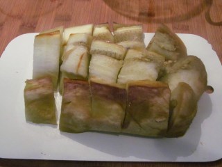 • Изстиналия патладжан обелих и нарязах на едри парчета.
