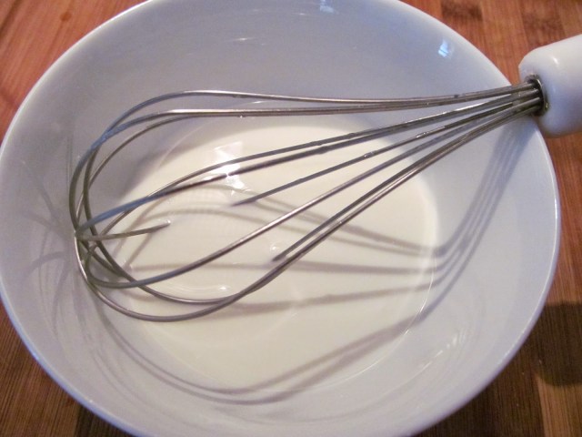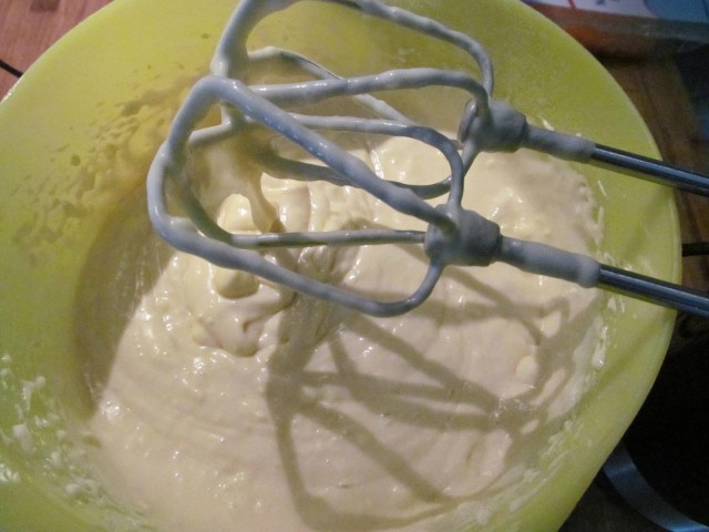 • Сменям накрайниците и продължавам разбиването още 5 до 7 минути, до получаването на гладко и гъсто тесто /гъстотата е като за бухти, не за палачинки/.